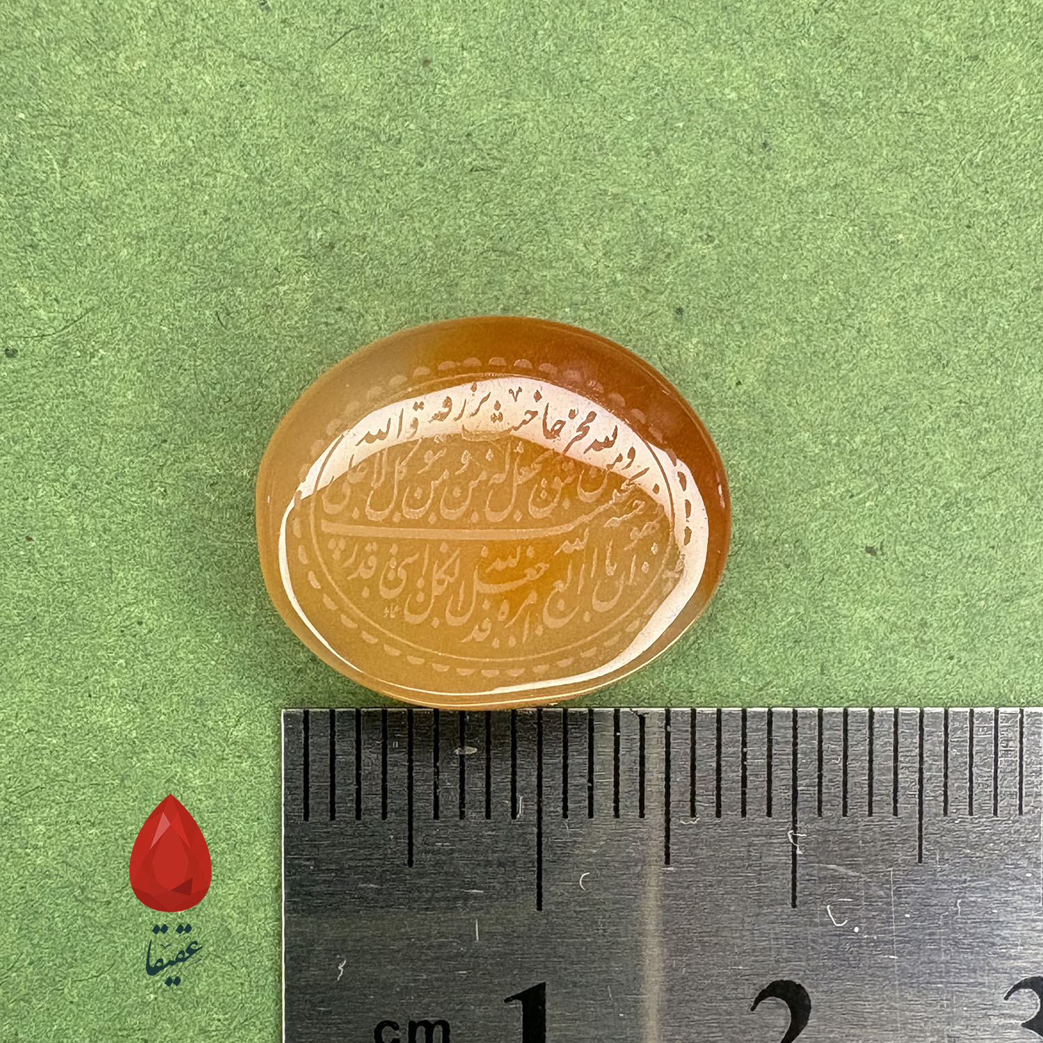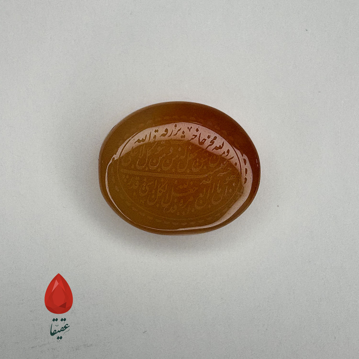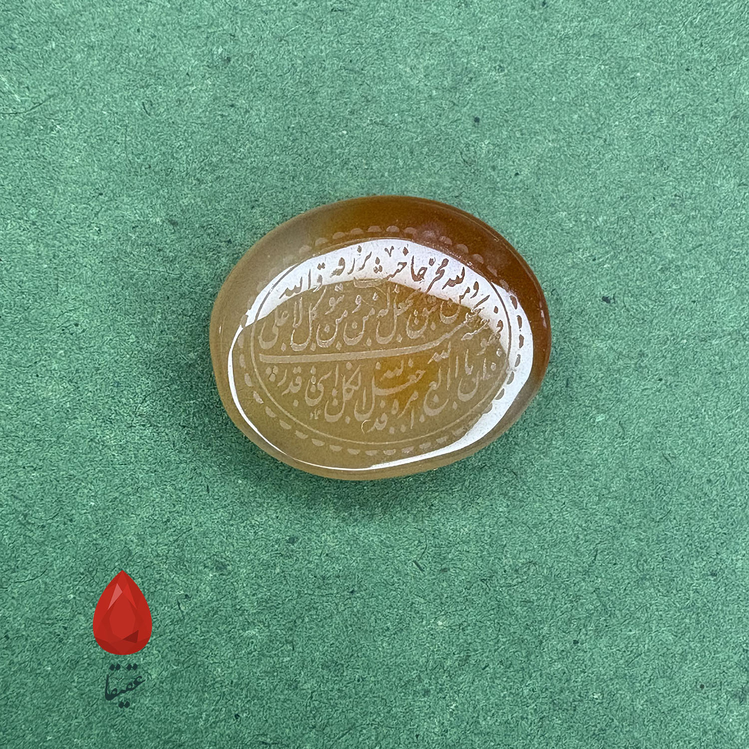 این سنگ با رنگی کهربایی مایل به قرمز و جلای طبیعی خود، جلوه‌ای گرم و معنوی دارد. ظرافت حکاکی آیه قرآنی، آن را به یک یادگار ارزشمند و ماندگار تبدیل کرده است که هم به عنوان یک همراه معنوی و هم یک اثر هنری منحصر به فرد، جایگاه ویژه‌ای دارد.