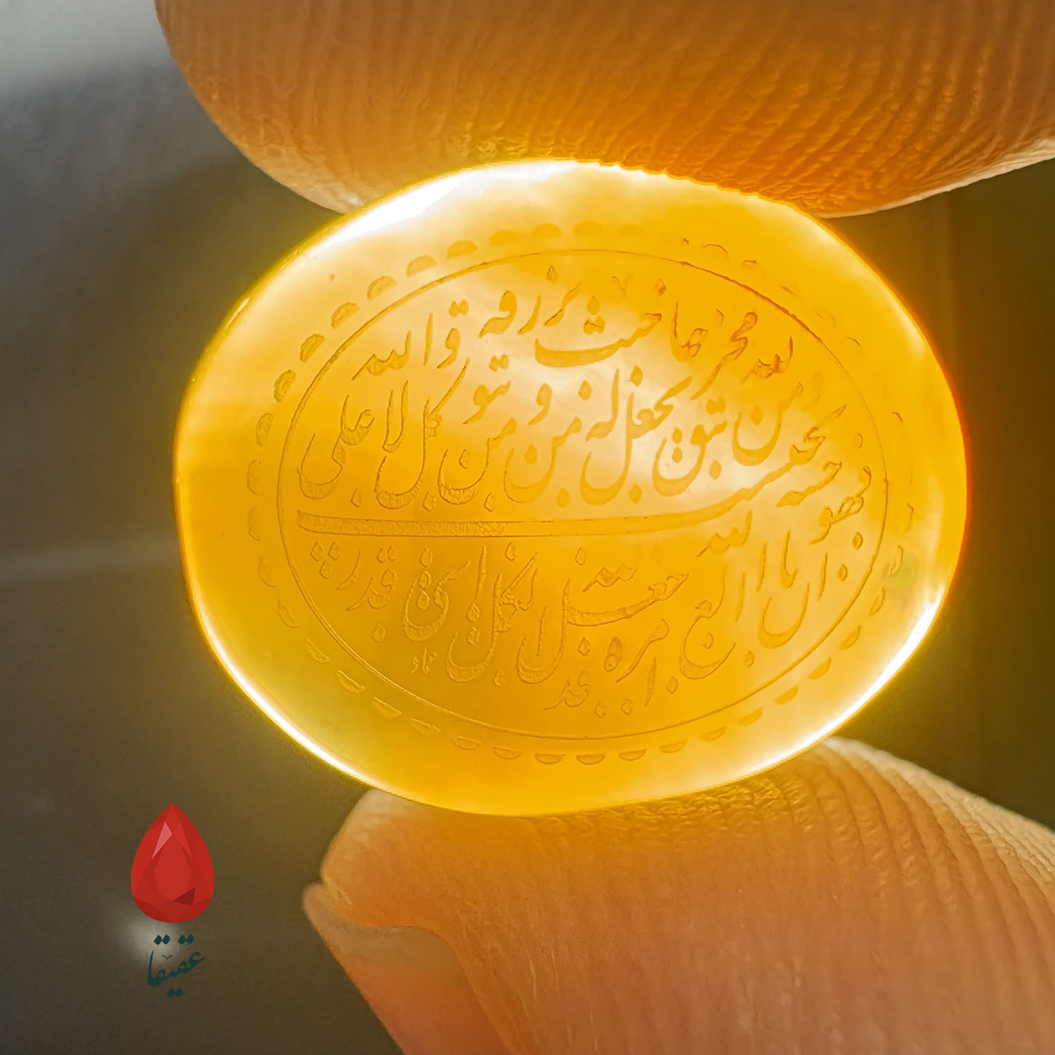 این سنگ عقیق کهربایی ارزشمند، با ظرافتی چشم‌نواز حکاکی شده و آیه شریفه «وَمَن یَتَّقِ اللَّهَ یَجْعَلْ لَهُ مَخْرَجًا وَیَرْزُقْهُ مِنْ حَیْثُ لَا یَحْتَسِبُ» را در دل خود جای داده است. این آیه یادآور وعده قطعی خداوند به اهل تقوا و توکل است و حضور آن بر روی سنگ، حسی عمیق از آرامش و اطمینان قلبی را منتقل می‌کند.