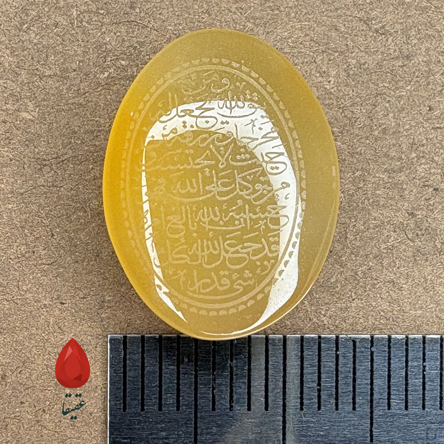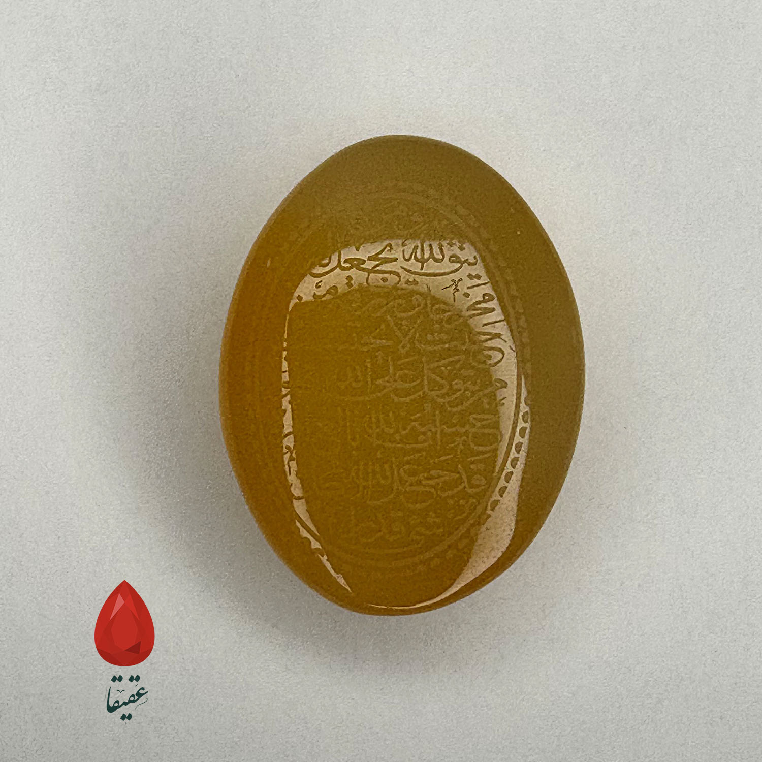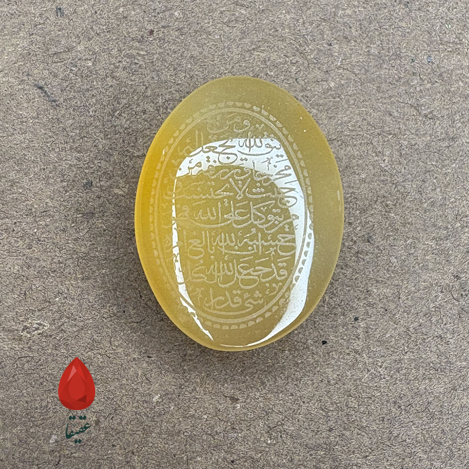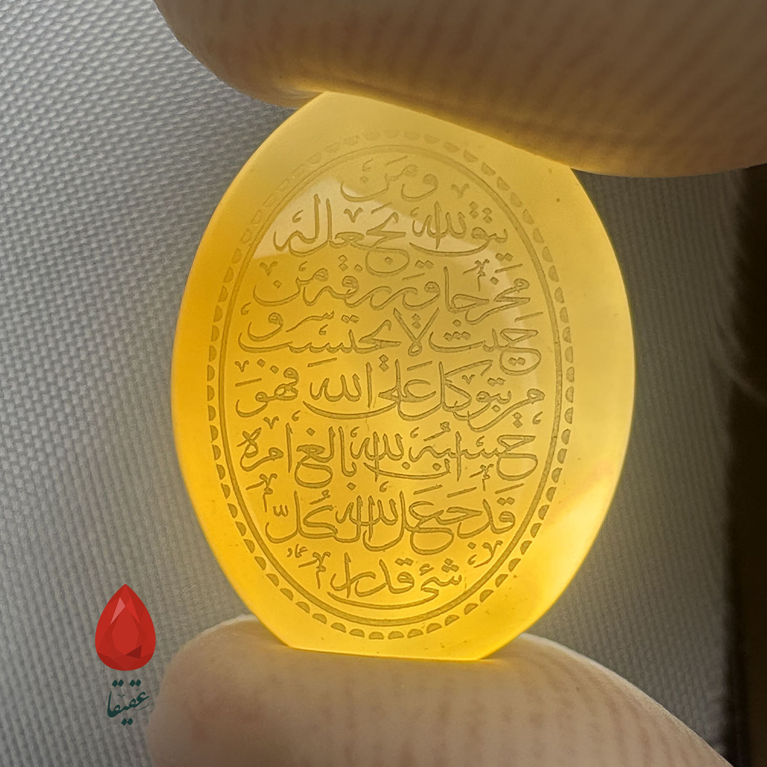 این سنگ زرد با رنگی گرم و دلنشین، آیه شریفهی «وَ مَن یَتَّقِ اللَّهَ یَجْعَل لَّهُ مَخْرَجًا…» را به زیبایی و ظرافت بر سطح خود حکاکی کرده است. این گوهر معنوی، منبعی از آرامش و نیروی درونی است که به صاحبش قدرت عبور از سختیها را هدیه میدهد.