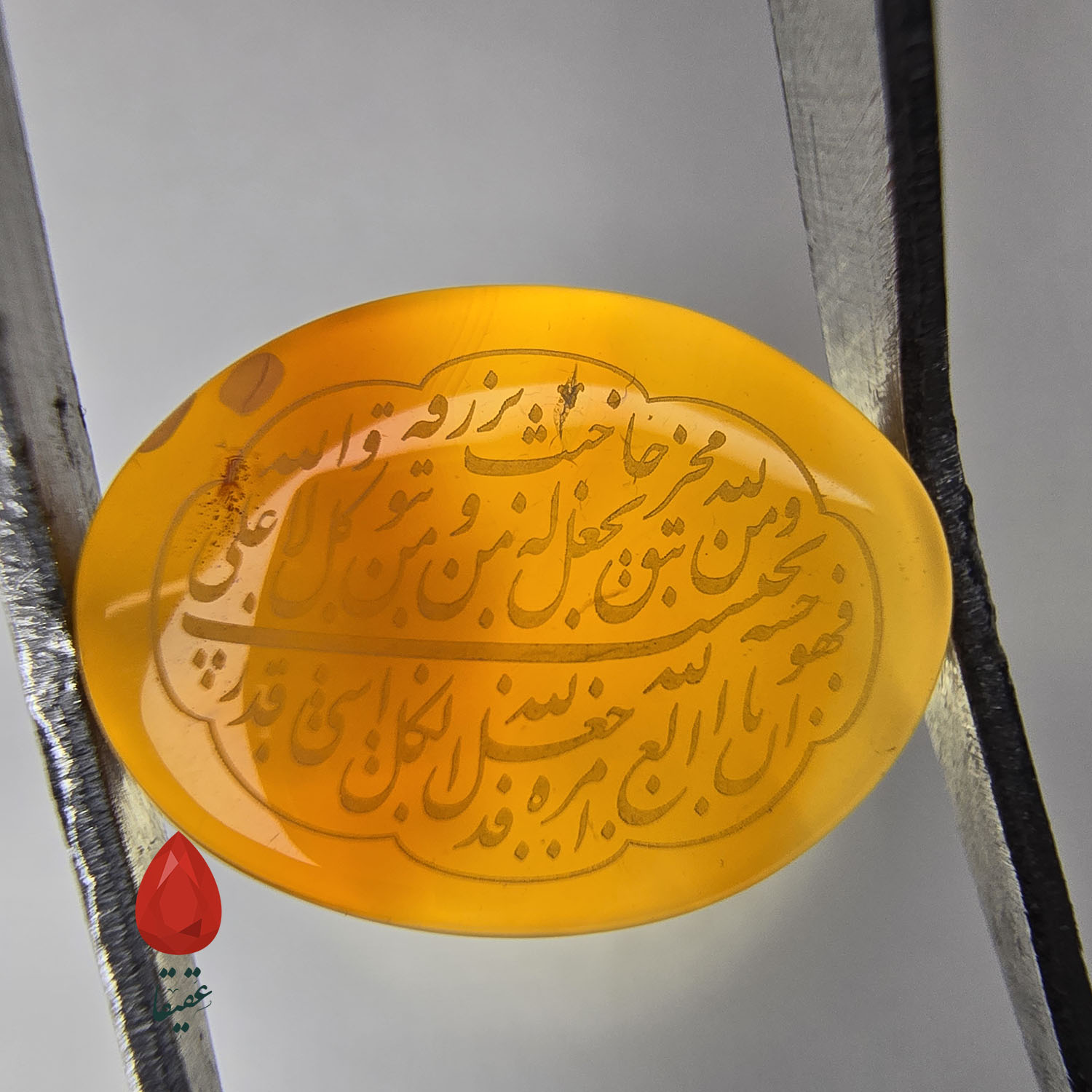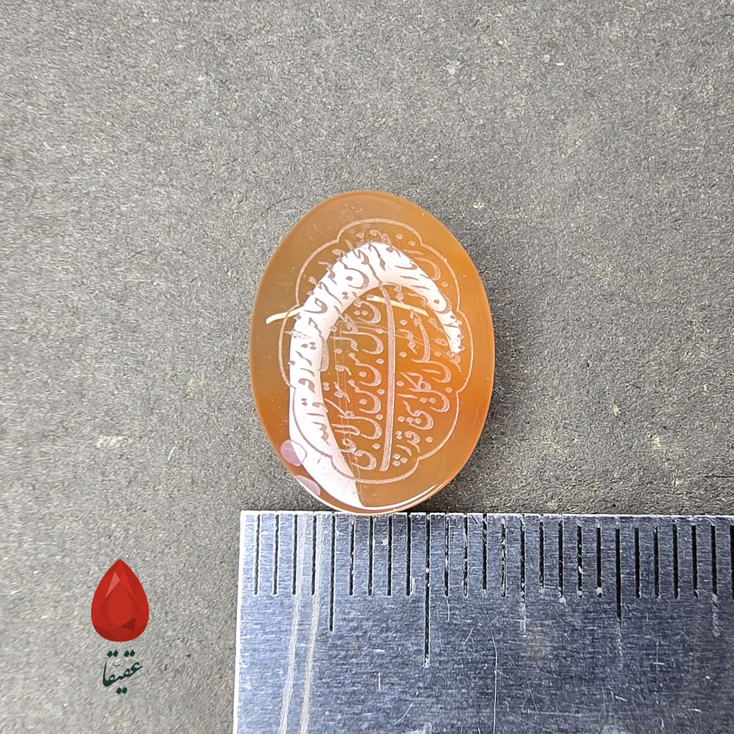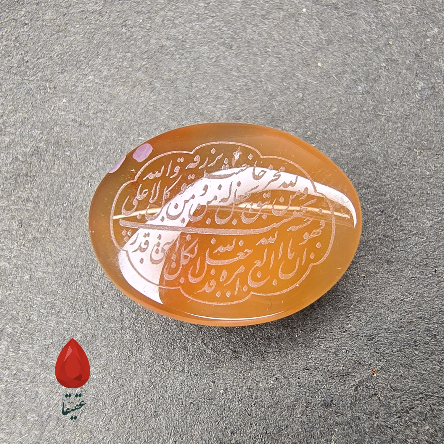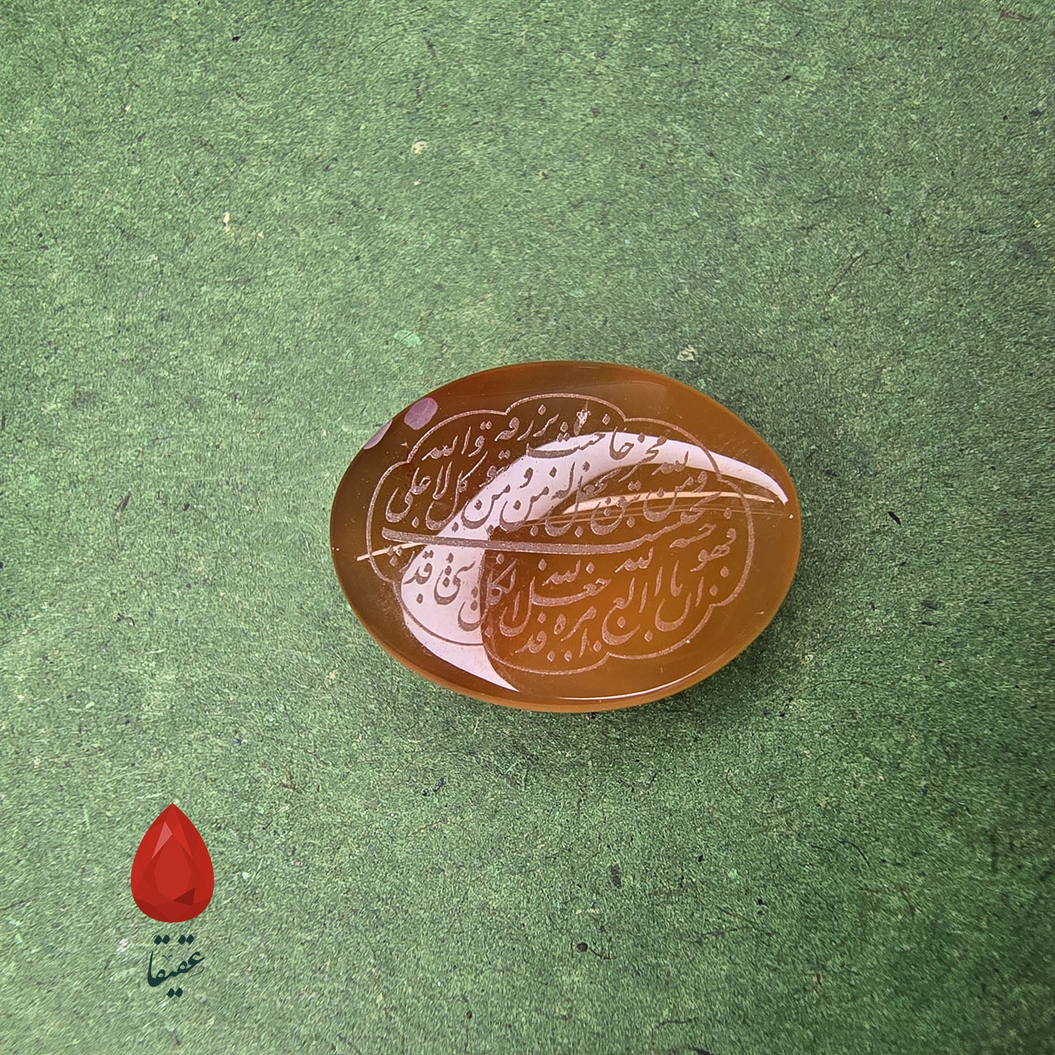 این سنگ عقیق قرمز با رنگی گرم و پرقدرت، نمادی از استحکام ایمان و آرامش درونی است. حکاکی آیه شریفه «وَ مَن یَتَّقِ اللَّهَ یَجْعَل لَّهُ مَخْرَجًا…» بر سطح این سنگ، آن را به همراهی معنوی تبدیل کرده که همواره یادآور وعده‌های الهی برای اهل تقوا و توکل است.