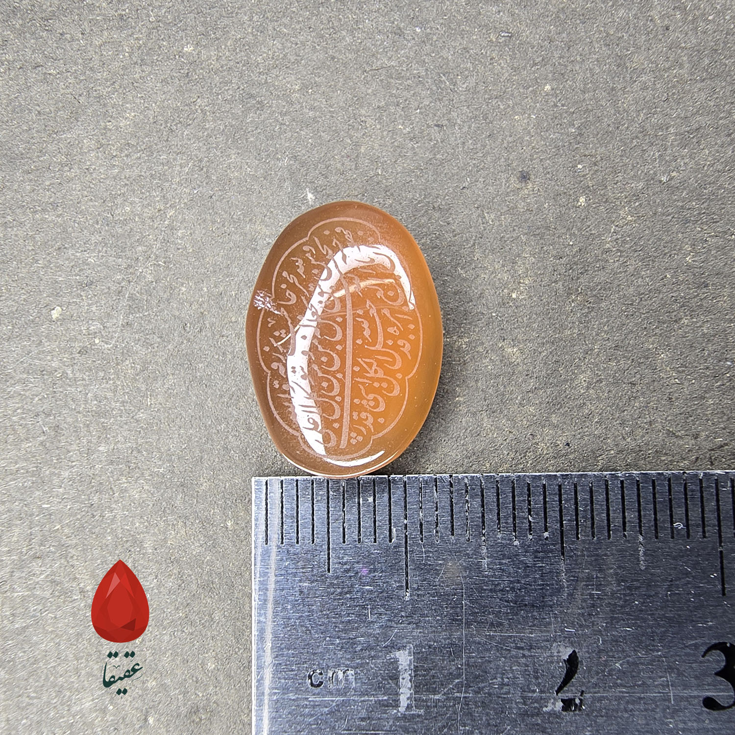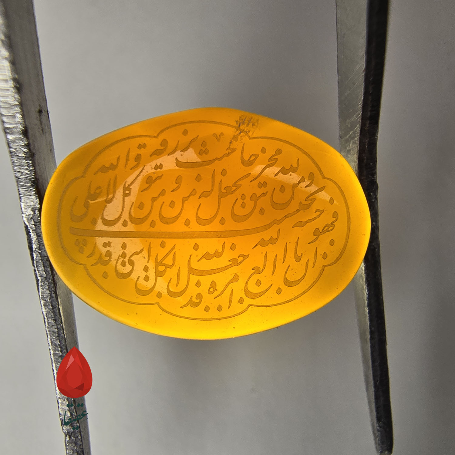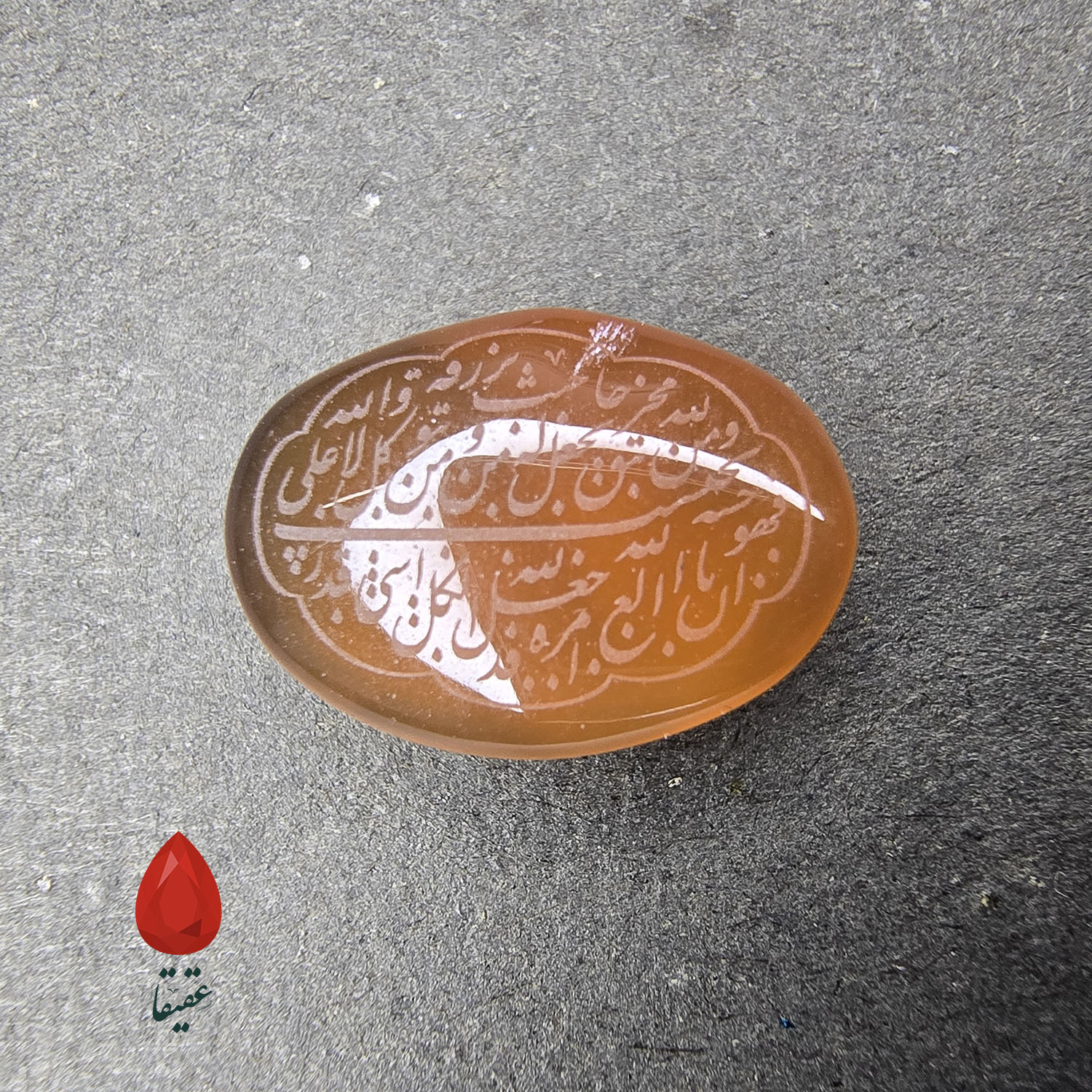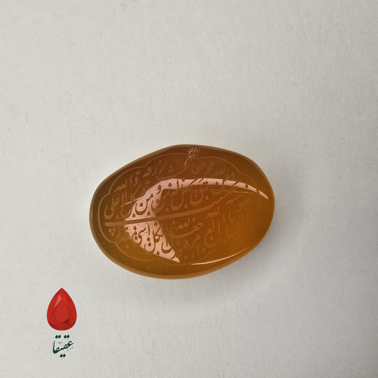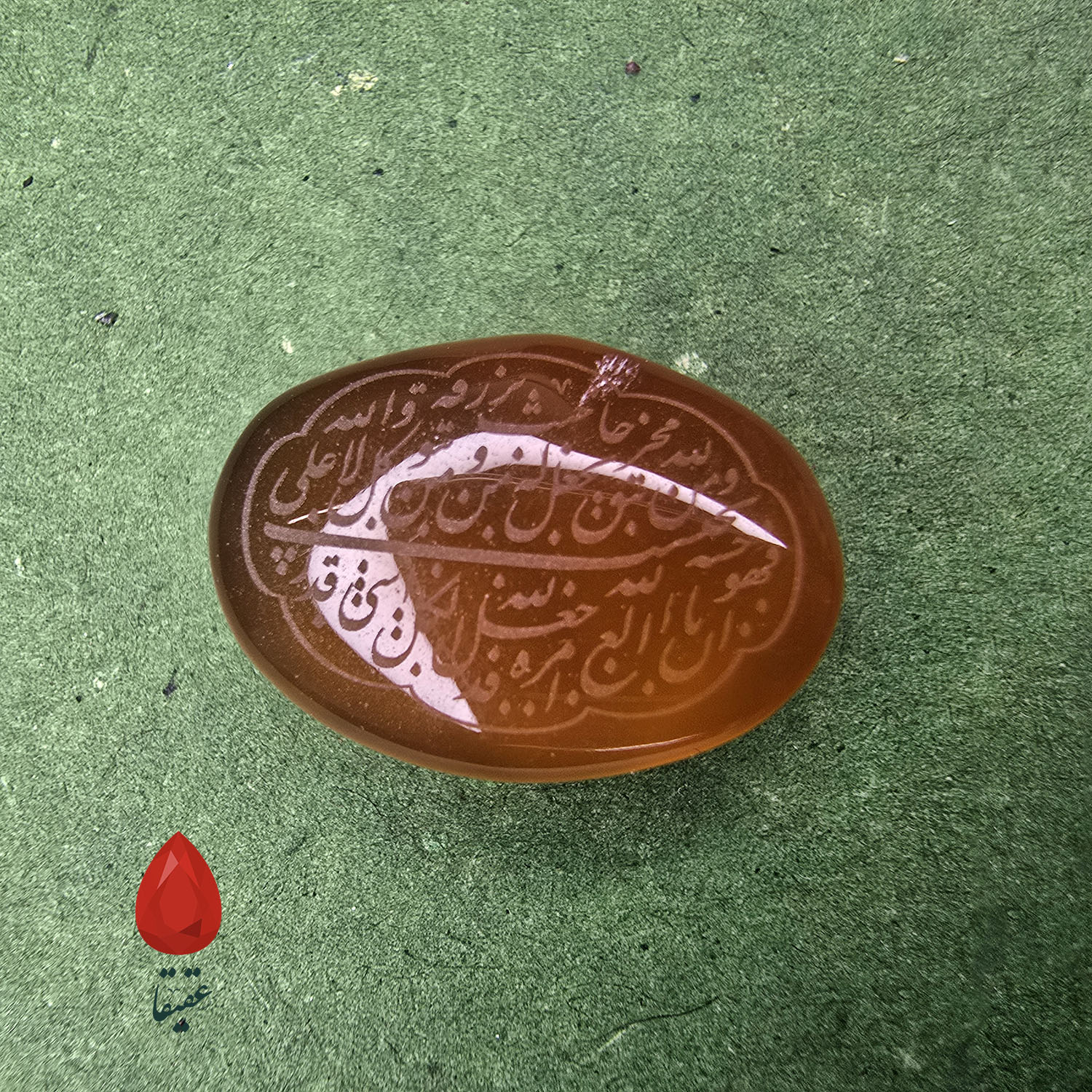 این سنگ عقیق قرمز اصل، با رنگی سرخ و پرانرژی، نمادی از شجاعت، عشق الهی و ایمان است. آیه شریفه «وَمَن یَتَّقِ اللّهَ یَجْعَل لَهُ مَخْرَجًا وَیَرْزُقْهُ مِنْ حَیْثُ لَا یَحْتَسِبُ» با ظرافتی مثال‌زدنی بر این نگین حکاکی شده تا همراهی معنوی و سپری نورانی برای صاحبان آن باشد.