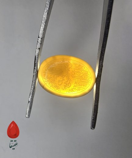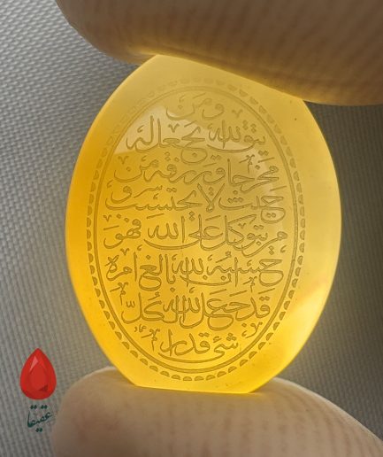 این سنگ عقیق کهربایی با طیف گرم و طلایی–کهربایی خود، جلوهای از شکوه طبیعت و معنویت را در کنار هم به نمایش میگذارد. بر روی آن عبارت نورانی «وَ مَن یَتَّقِ الله یَجعل له مخرجا و یَرزقه من حیث لا یحتسب» (سوره طلاق، آیات ۲-۳) به ظرافت حکاکی شده است؛ آیهای که یادآور وعده قطعی خداوند به گشایش و روزی بیحساب برای اهل تقواست.